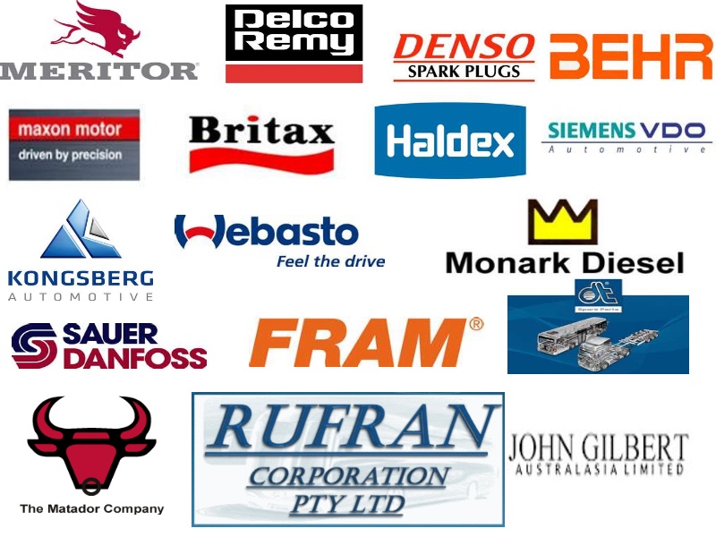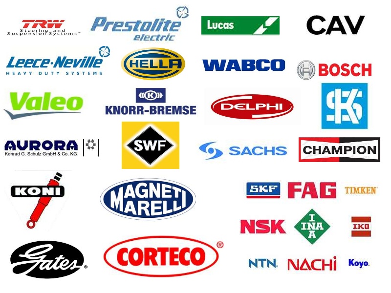 TRW, Prestolite, Lucas, CAV, Leece Neville, Hella, Wabco, Bosch, Valeo, Knorr Bremse, Delphi, Aurora, KS, SWF, The Matador Company, Sachs, Koni, Champion, Magneti Marelli, SKF, FAG, Timken, INA, NTN, Gates, Corteco, Meritor, Delco Remy, Denso, Behr, Maxon, Haldex, Britax, Kongsberg, Webasto. Monark, Sauer Danfoss, Fram, Diesel Technic, John Gilbert.
